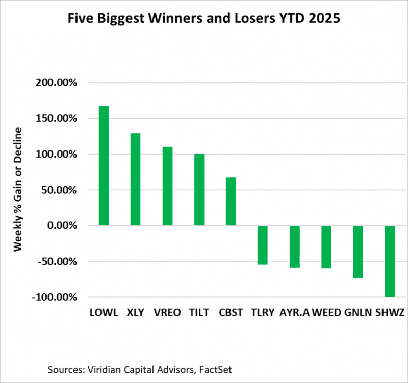 • Cannabis equity prices (as measured by the MSOS ETF) declined 3.32% for the week, finishing at all-time lows.