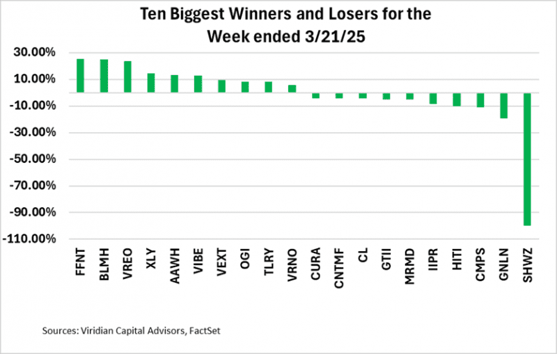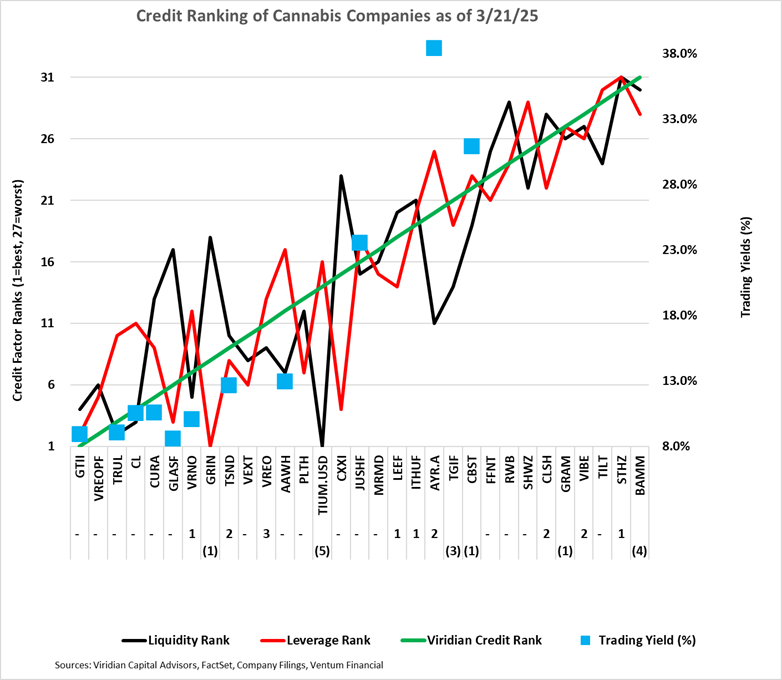 • The chart below shows our updated 3/21/25 credit rankings for 31 U.S. cannabis companies. The number below the ticker symbol indicates the change in credit ranking since last week. A negative number suggests credit deterioration, while a positive number indicates improvement.
