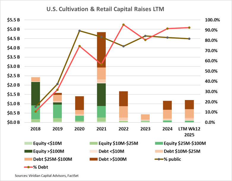 • Cultivation and retail sector capital raises were $1.20B for the LTM period, 3.5% higher than 2024, which in turn was up 167% from 2023.