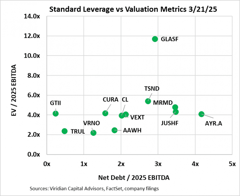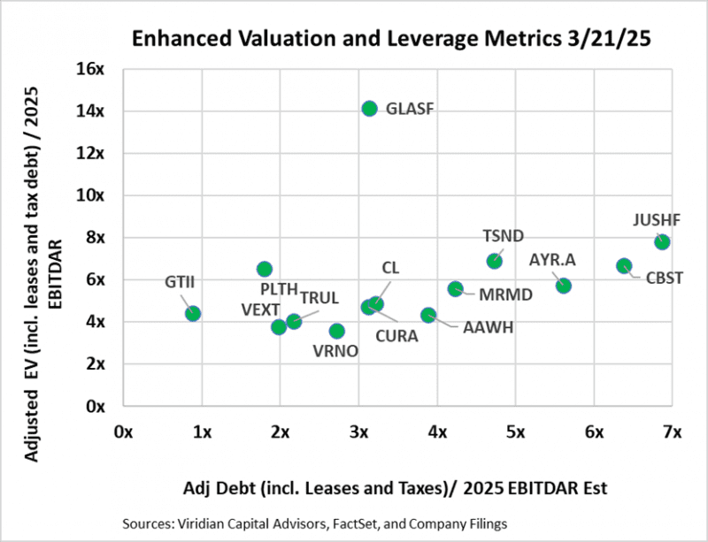 • The first graph presents our latest view of the most appropriate valuation and financial statement-based leverage metrics: Adjusted EV / 2025 EBITDAR and Adjusted net debt / 2025 EBITDAR. In calculating Adjusted Net Debt, we make several key assumptions: 1) Leases that are included on the balance sheet are considered debt. We view most leases in the cannabis space as equivalents to equipment loans or mortgage loans. While it is true that a lease default does not necessarily trigger a cascade of events leading to bankruptcy, the distinction is often meaningless in cannabis due to the mission-critical nature of many long-term leases and the absence of bankruptcy protection in cannabis. 2) We consider any accrued taxes (including uncertain tax liability accounts listed as long-term liabilities) in excess of the most recent quarterly tax expense to be debt. Our calculation of enterprise value is now market cap plus debt plus leases plus tax debt minus cash. We now use EBITDAR rather than EBITDA since lease expense is taken out prior to EBITDA.