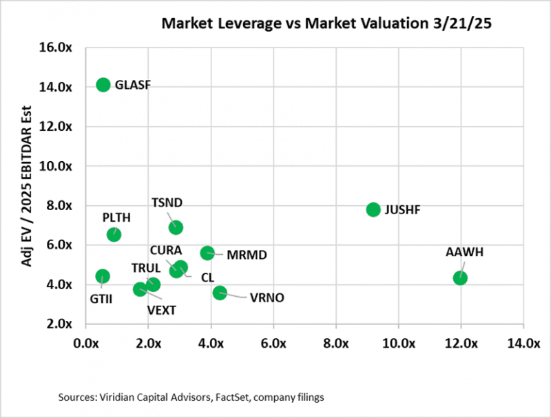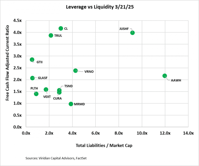 • On the bottom left are companies with Adj EV/2025 EBITDAR of under 6x and total liabilities to market cap under 2x. The group includes Vext, GTI, and Trulieve. Companies in this quadrant are right to consider stock repurchases or using cash in acquisitions. They can afford some additional debt and can take advantage of the ongoing dislocation in equity prices.