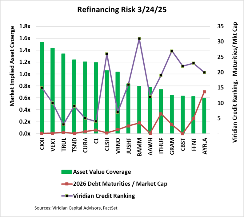 • The red line represents the multiple of market cap that 2026 debt maturities represent. Clearly, the larger the debt maturities relative to the market cap, the more difficult we would expect refinancing to be. The seven companies from ITHUF to the right side of this graph (except Cannabist) represent high risk. They have less than 1x asset value coverage, poor Viridian Credit Ranks, and maturing debt that is a multiple of market cap. Companies in this position represent approximately $867M of the maturing debt. Conversely, the five companies on the left-hand side of the graph represent low refinancing risk. They have solid asset coverage, strong Viridian Credit Ranks, and maturing debt that is less than 1x market cap. These companies represent $1.6B of the $2.6B total (62%), and we believe they should all be able to refinance their maturities without undue pain.