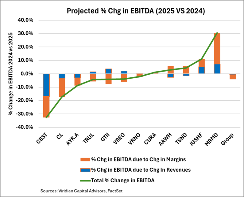 • The first of the two charts below, reprinted from previous charts of the week, decomposes the percentage change in EBITDA from q4:23 to q4:24 into components of revenues and EBITDA margins. The second chart completes the same exercise for projected 2025 EBITDA vs 2024. For 2025, the outlook is for flat revenues and lower margins.