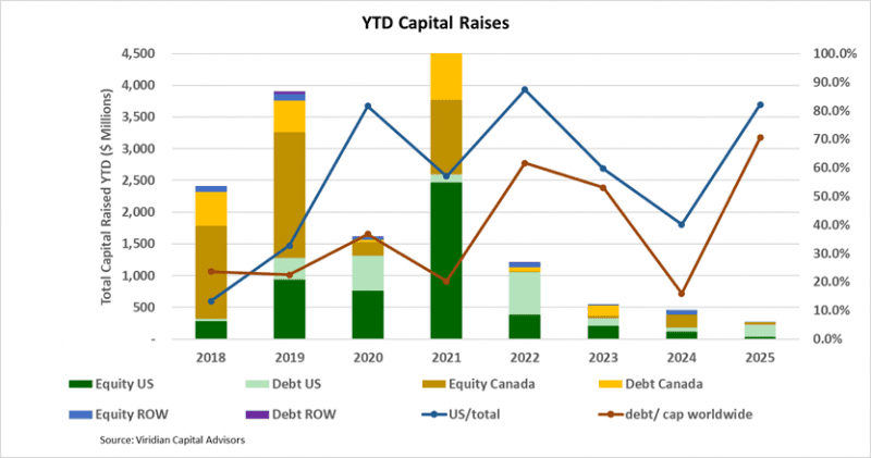• Canada is down the most. The brown bar on 2024’s graph represents the $197M Canadian equity raised, which dropped to only $30.1M YTD in 2025.