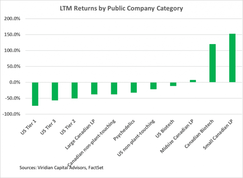• U.S. Tier one through three MSOs now are the worst three YTM return categories, which is not that surprising given that many of these stocks are now trading at or near all-time lows. Tier one is now down 74% for the LTM period. The most significant change since last week is the two-notch improvement in Psychedelic sector YTM returns, which now clock in at -33%.