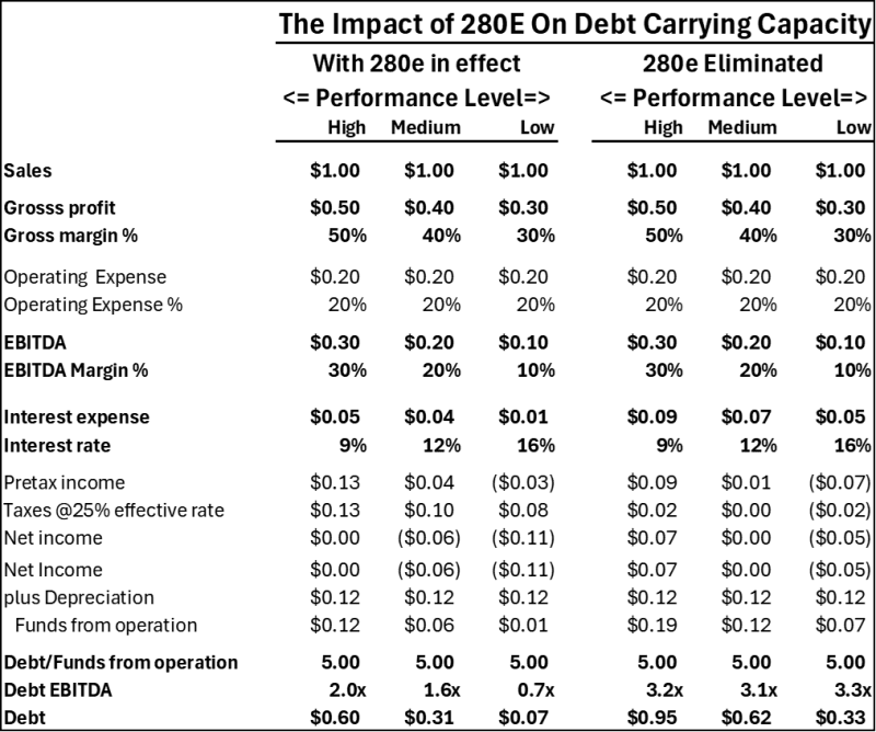 • Most people know that eliminating 280E would improve cannabis companies’ cash flows and debt capacity; however, the exact mechanism of this improvement and the extent of the improvement are not widely understood.