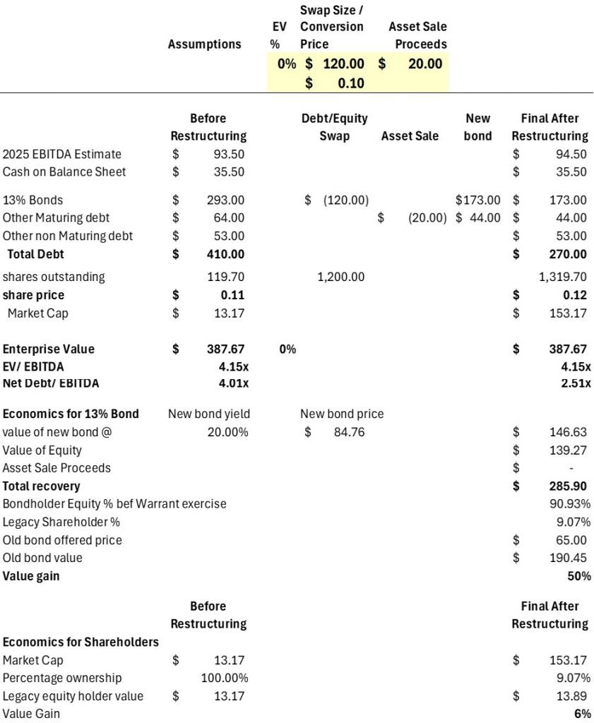 • The essence of our plan is to exchange $120 million of the maturing 13% notes due 2026 for approximately 91% of the company’s equity by issuing 1.2 billion shares at a conversion rate of $0.10 per share to the noteholders. The remaining $173 million of 13% notes would be extended by three years, with a company option to extend an additional year for a fee to be determined.