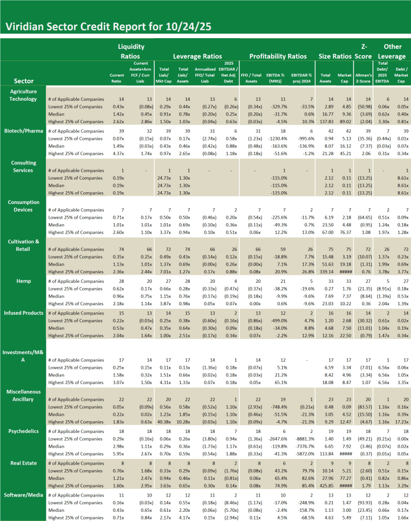 Credit ratings are not currently available for public cannabis companies leaving companies, lenders and investors with a gap of information. The Viridian Cannabis Credit Tracker fills this gap. The model uses 11 market and financial statement variables to discern 4 key credit factors: Liquidity, Leverage, Profitability, and Size, to provide credit/liquidity analysis for over 370 public Cannabis/Hemp companies.