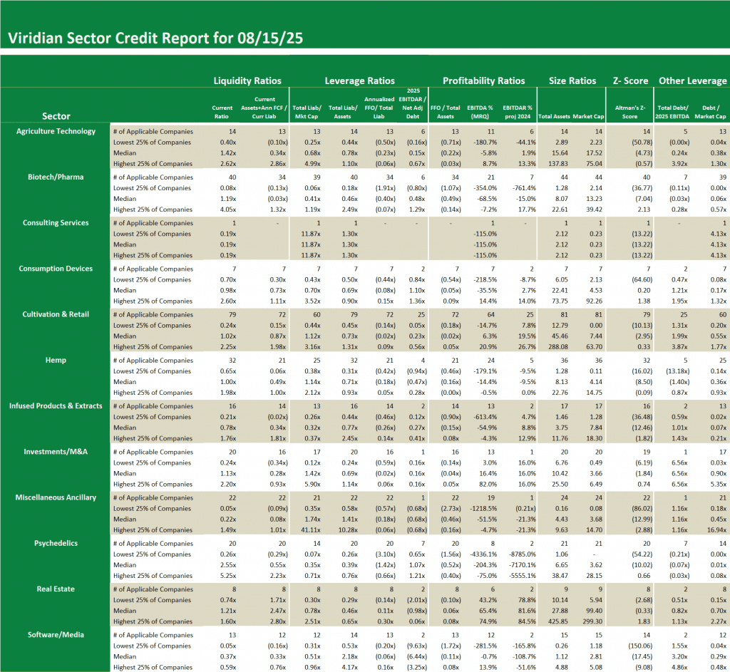 Credit ratings are not currently available for public cannabis companies leaving companies, lenders and investors with a gap of information. The Viridian Cannabis Credit Tracker fills this gap. The model uses 11 market and financial statement variables to discern 4 key credit factors: Liquidity, Leverage, Profitability, and Size, to provide credit/liquidity analysis for over 370 public Cannabis/Hemp companies.