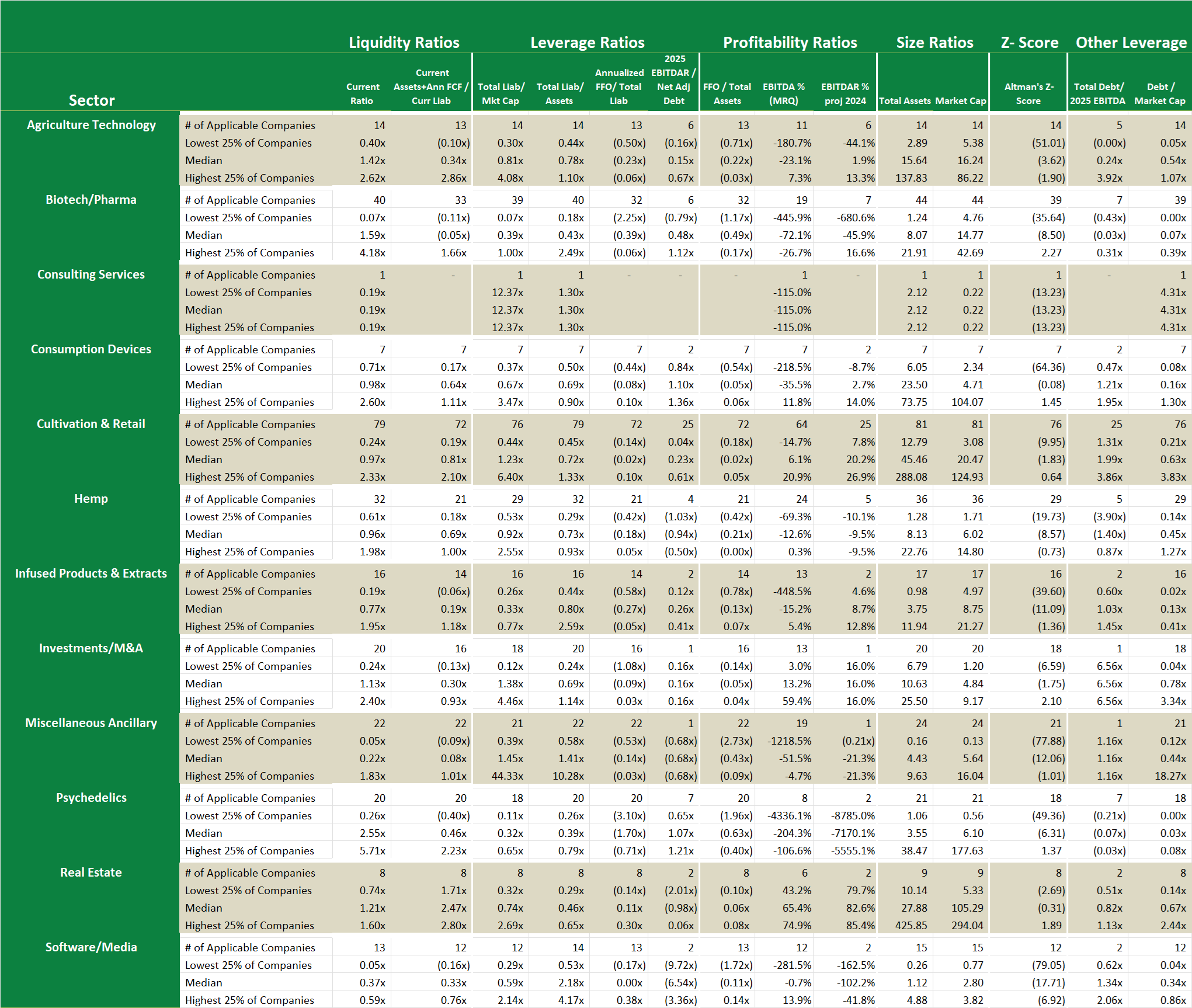 Credit ratings are not currently available for public cannabis companies leaving companies, lenders and investors with a gap of information. The Viridian Cannabis Credit Tracker fills this gap. The model uses 11 market and financial statement variables to discern 4 key credit factors: Liquidity, Leverage, Profitability, and Size, to provide credit/liquidity analysis for over 370 public Cannabis/Hemp companies.