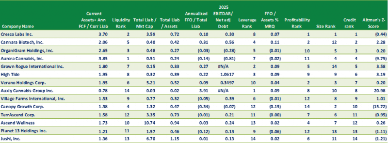 Each week, Viridian highlights a specific industry sector and provides a deep dive into credit metrics and comparable company credit rankings for public companies operating in that sector. Credit ratings are not currently available for public cannabis companies leaving companies, lenders, and investors with a gap of information. The Viridian Cannabis Credit Tracker fills this gap. The model uses 11 market and financial statement variables to discern 4 key credit factors: Liquidity, Leverage, Profitability, and Size, to provide credit/liquidity analysis for over 370 public Cannabis/Hemp companies.