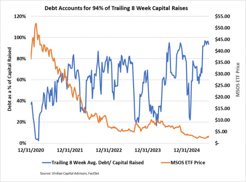 • Debt accounted for 94% of trailing 8-week capital raises. The ratio may go down if companies are able to utilize favorable regulatory-induced stock price increases to complete equity issues. However, equity pricing has remained stubbornly low while the cannabis debt capital markets have reopened.