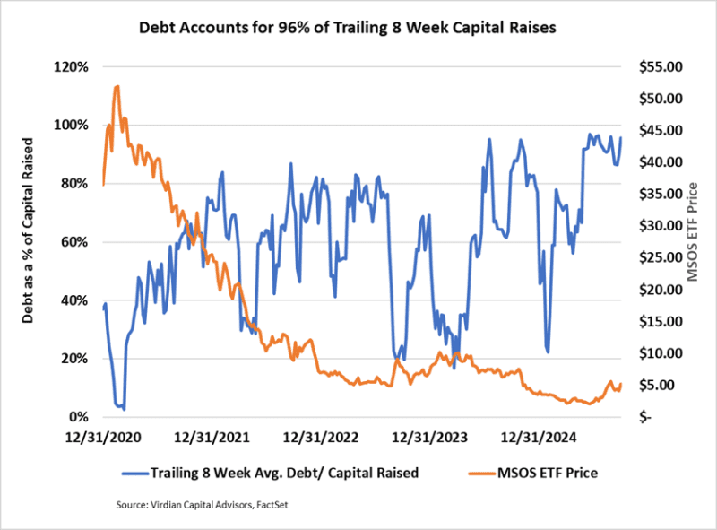 • Debt accounted for 96% of trailing 8-week capital raises. The ratio may increase if companies can utilize favorable regulatory-induced stock price rises to complete equity issues. We believe that a successful move to S3 will increase the likelihood of other near-term regulatory moves, such as the SAFER or STATES. The real question is what kind of price increase will it take before cannabis companies are willing to issue equity? Will the change to S3 result in a lasting price pop that could lead to re-equitization?