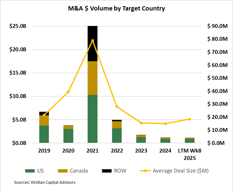 • LTM, 60 M&A transactions have closed with a total disclosed value of $1.10B, down from the 113 deals for $1.75B in 2023. M&A activity has not yet rebounded from 2024, which had the lowest transaction volume in the last six years.