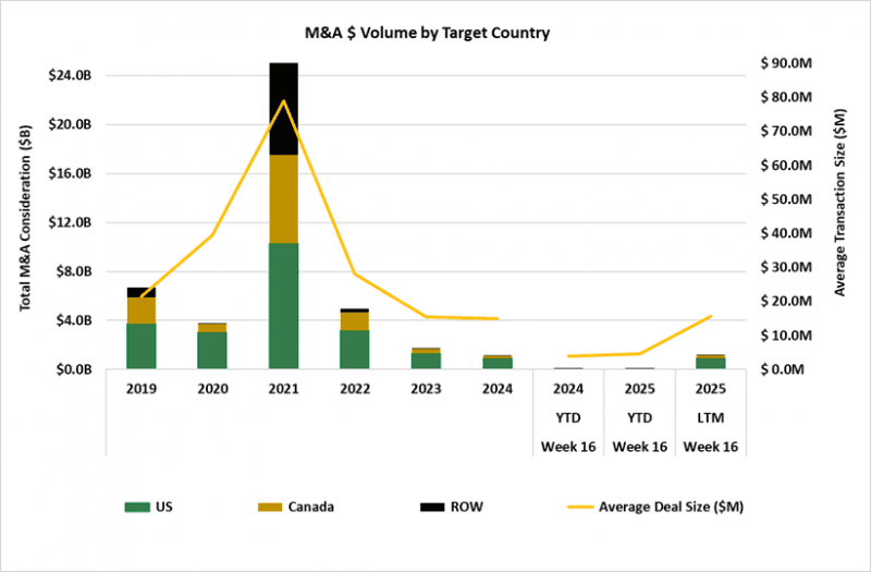 • YTD’s total M&A consideration is down 28.0% from the same period in 2024, and the deal count is down approximately 37.5%. However, transactions targeting the U.S. are up 244.2% from around $9M to $32M. LTM, 69 M&A transactions have closed with a total disclosed value of $1.14B, down only 2.3% from 2024, reflecting the fact that the LTM total is composed of 36 weeks of 2024 and 16 weeks of 2025.