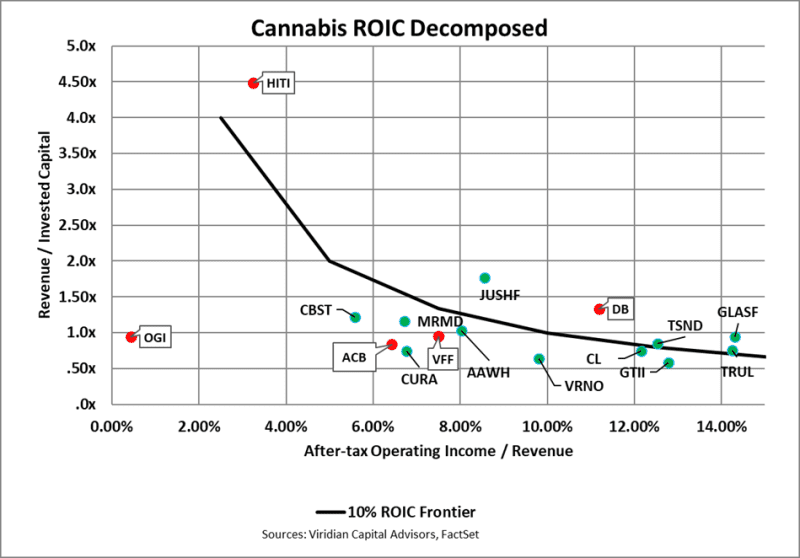 - The four companies that have ROICs significantly above the 10% frontier —High Tide (HITI: Nasdaq), Decibel (DB: TSX), and Glass House Brands (GLASF: OTCQX) —got there by quite different means. High Tide has relatively low after-tax margins but the highest sales/invested capital of any company on the Chart. Jushi has middle-of-the-road margins but the second-highest Revenues / Invested Capital. Decibel mixes the third-highest asset productivity with better-than-average margins. Glass House has the highest projected after-tax operating profit/ Revenues.