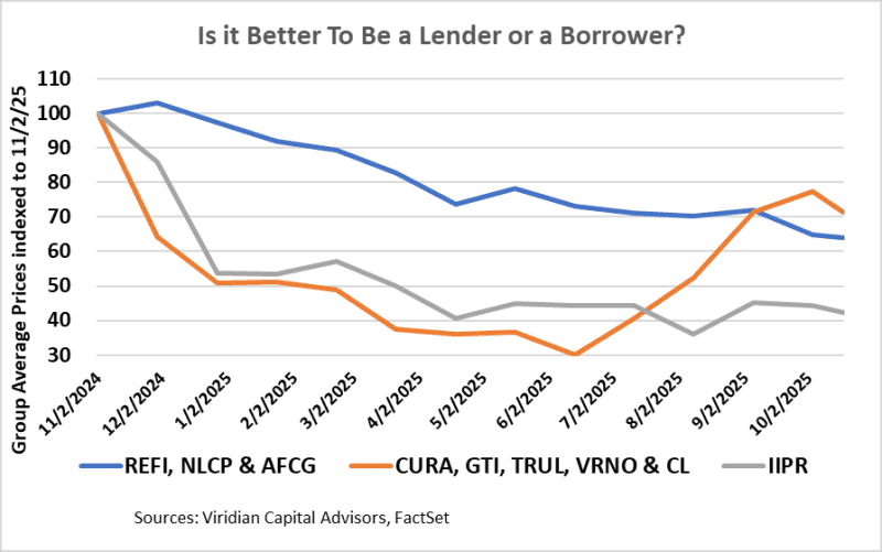 - The Chart below shows the indexed average price movements of a group of lenders including Chicago Atlantic, NewLake Capital Partners, AFC Gamma, and IIPR, compared to the MSO group, including Curaleaf, GTI, Trulieve, Verano, and Cresco.