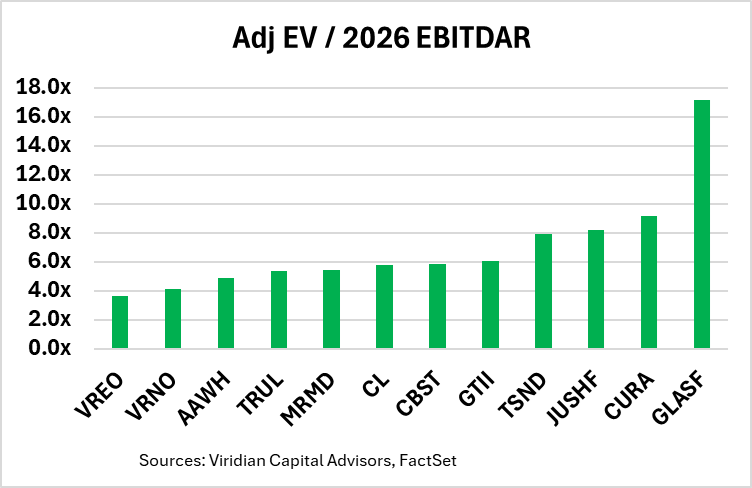 - The chart below ranks the top 12 MSOs by our bespoke valuation measure, Adjusted Enterprise Value / 2026 EBITDAR, which we believe more accurately captures the true valuation picture: