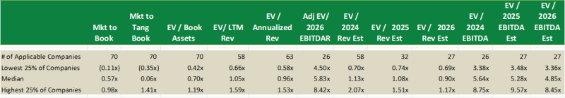 - The median EV/2026 EBITDA ratio is 4.07x, down a full turn from 5.1x last week, and the Viridian bespoke measure of Adj EV/2026 EBITDAR is not much higher at 4.9x (compared to 5.72x last week). The Viridian measure takes into account both excess tax liabilities and operating leases in the definition of enterprise value.