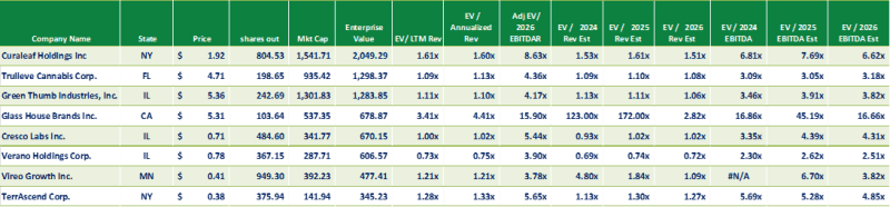 - Despite the volatility, we expect 2026 to be a strong year for plant-touching valuations. Revenue growth is expected to rebound as several new states are getting closer to passing recreational cannabis laws. Analysts are projecting a turnaround in y/o/y EBITDA comparisons beginning in the 2nd quarter of 2026
