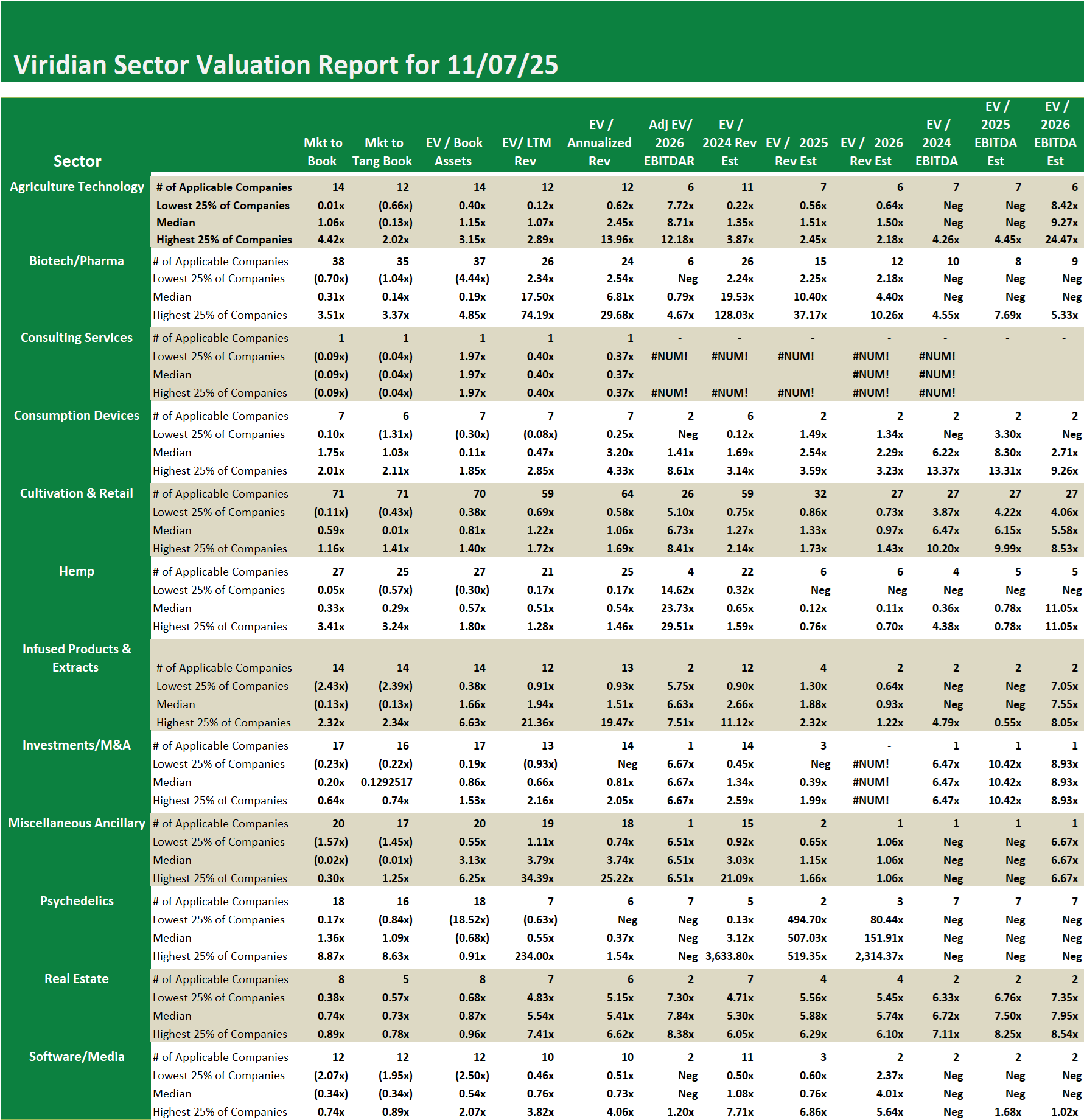 - A broad set of 12 valuation measures assures applicability, regardless of whether the company has analyst coverage or revenues. The typically presented EV/ Projected Revenues and EV/ Projected EBITDA are available for less than 1/3 of the cannabis companies we track.