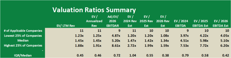- Of the 14 companies in the sector, only 6 have analyst estimates for 2026. Median EV/ 2026 EBITDA is 9.27x, reflecting EBITDA turning positive for the first time in two years. The median EV / 2026 revenues is now 1.5x, but the median EV/annualized revenue is much higher at 2.45x, reflecting higher revenue valuations in the unrated cohort.