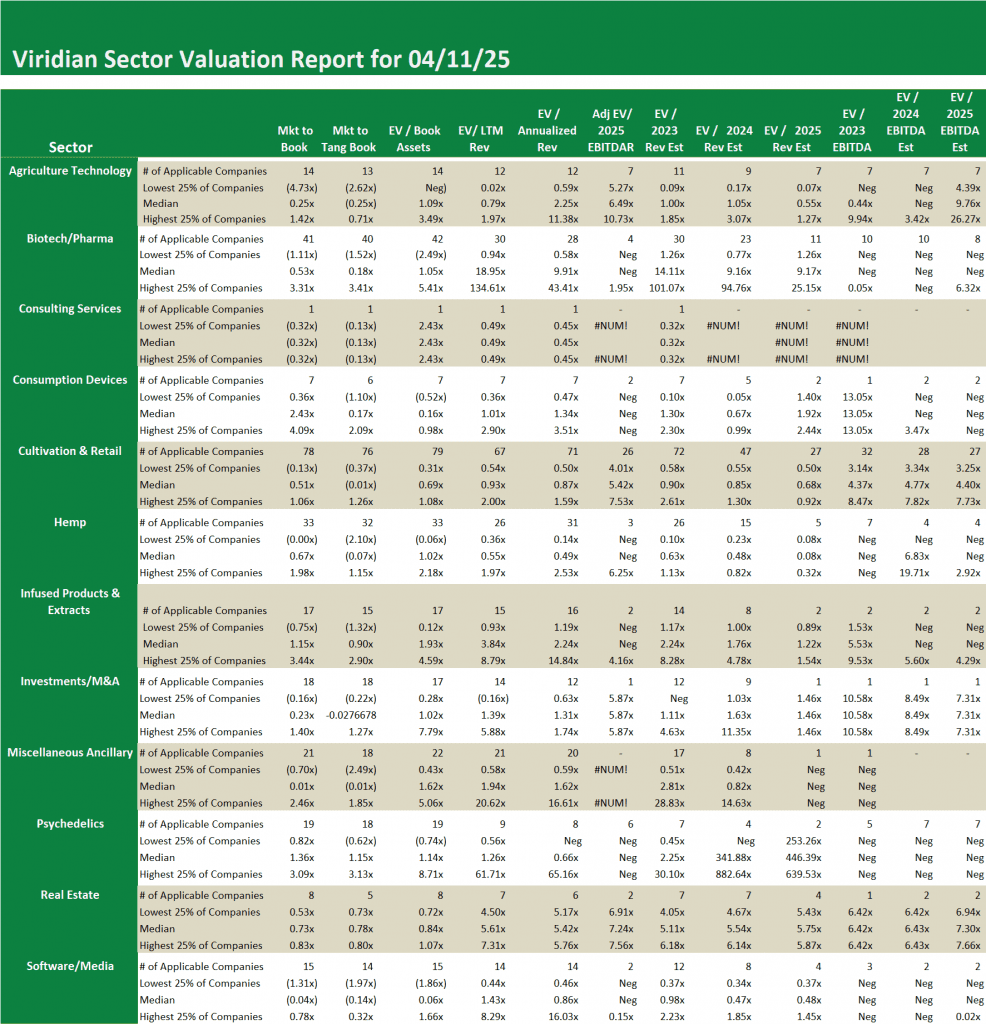 • A broad set of 12 valuation measures assures applicability, regardless of whether the company has analyst coverage or revenues.  The typically presented EV/ Projected Revenues and EV/ Projected EBITDA are available for less than 1/3 of the cannabis companies we track.