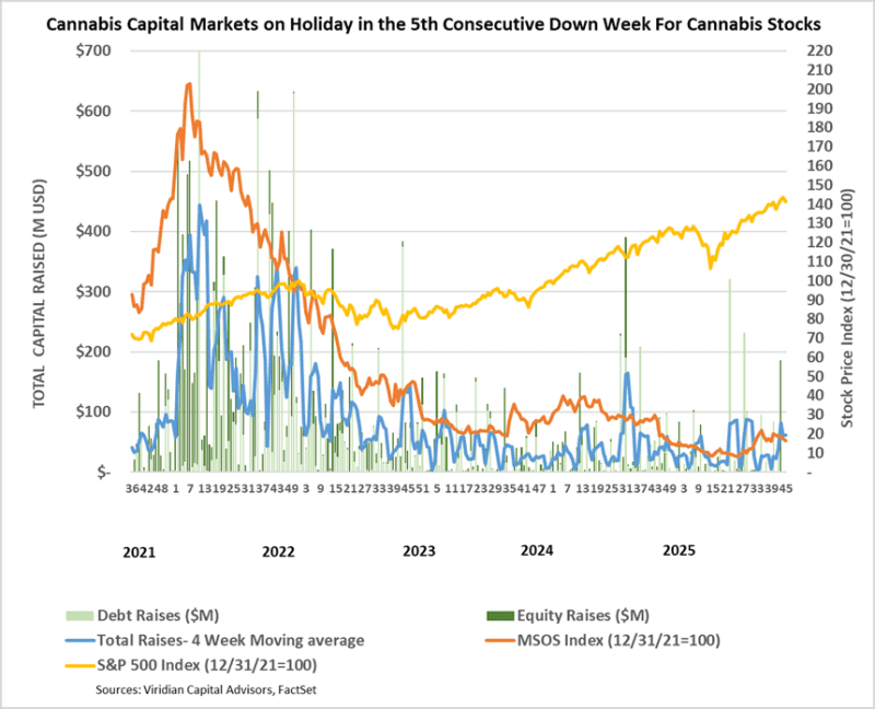 - Cannabis equity prices (as measured by the MSOS ETF) fell by 6.46% for the week.