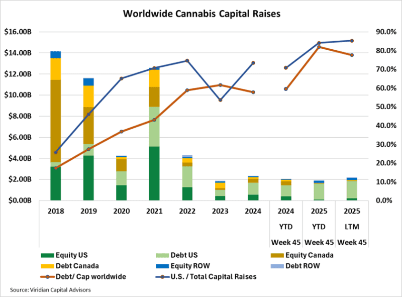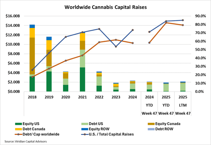 - YTD capital raises for the cultivation and retail sector total $1.28B, up 31.3% from last year’s $971.6M. For the LTM period, the capital raised in the cultivation and retail sector was $1.46B, 26.3% higher than in 2024, which in turn was 160% higher than in 2023.