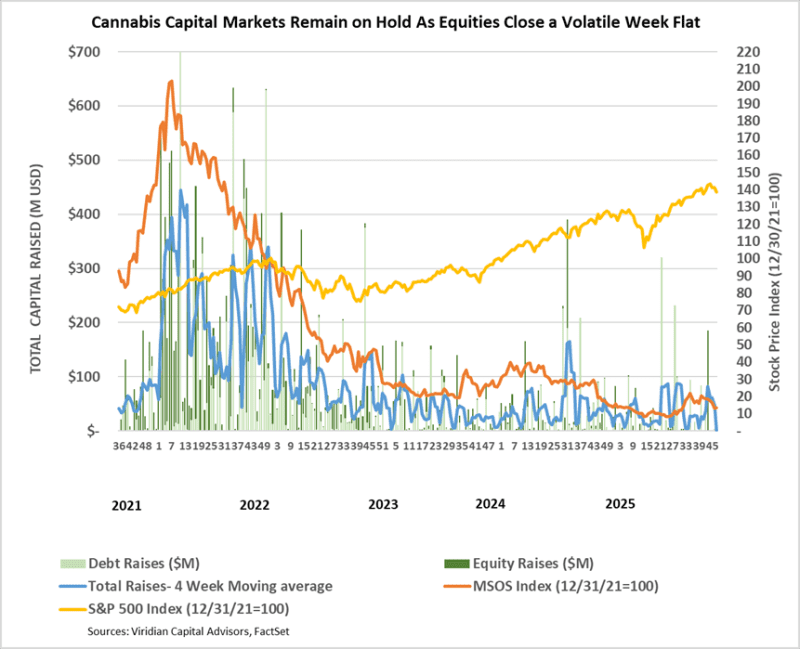 - Cannabis equity prices (as measured by the MSOS ETF) rose by 2.65% for the week.