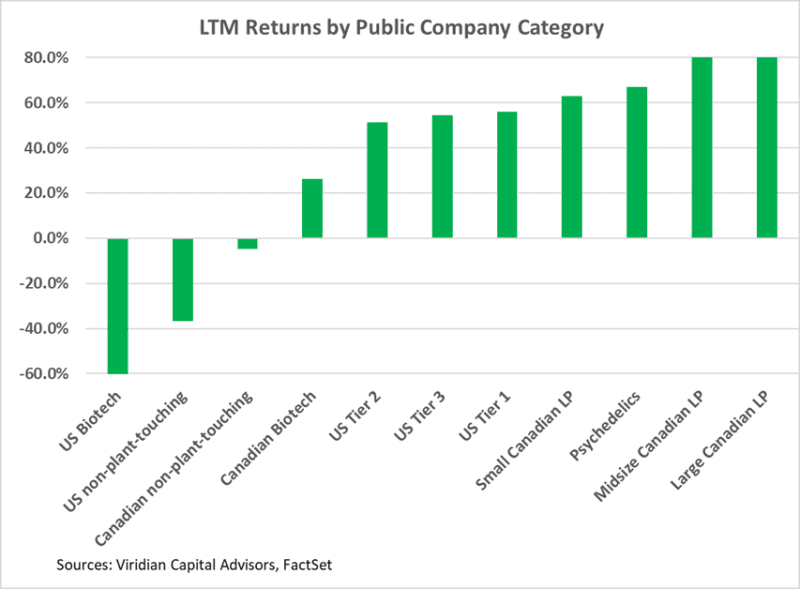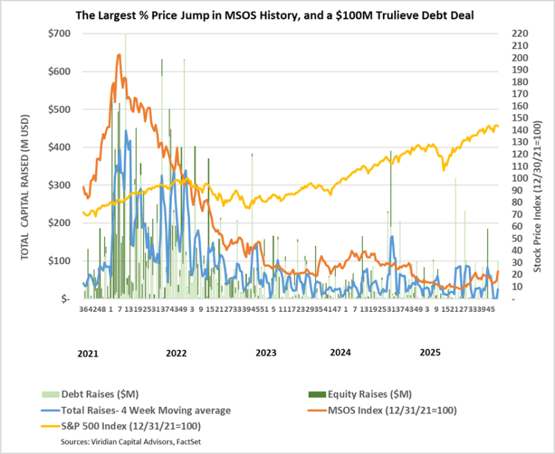- Cannabis equity prices (as measured by the MSOS ETF) rose by 49.1% for the week.