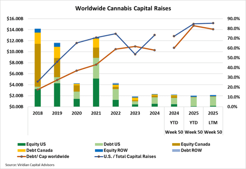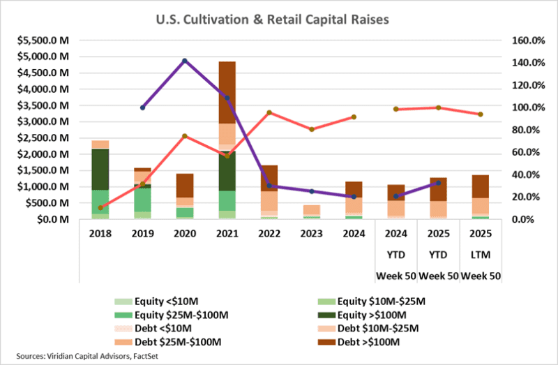 - YTD capital raises for the cultivation and retail sector total $1.38B, up 28.8% from last year’s $1.07B. For the LTM period, the capital raised in the cultivation and retail sector was $1.47B, 26.6% higher than in 2024, which in turn was 160% higher than in 2023.