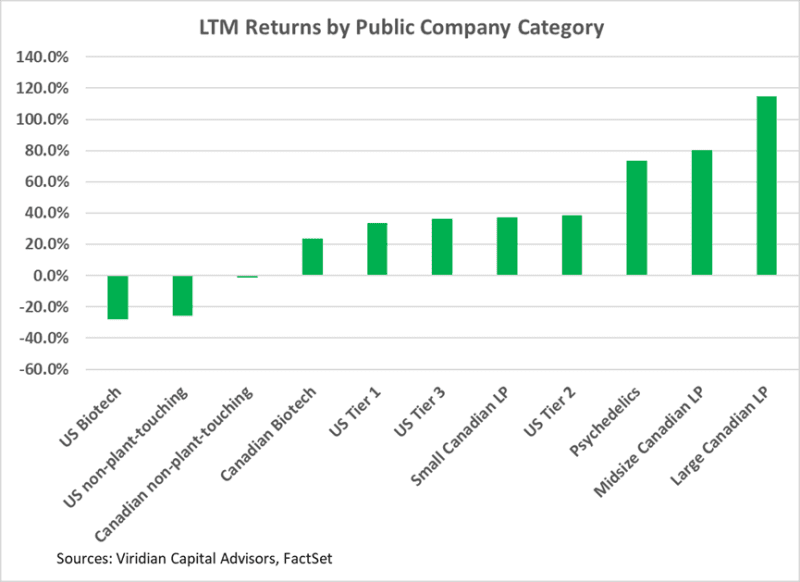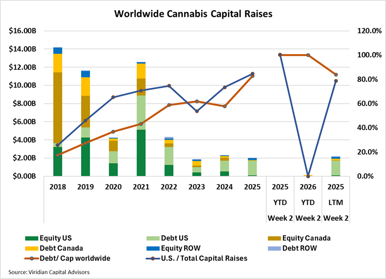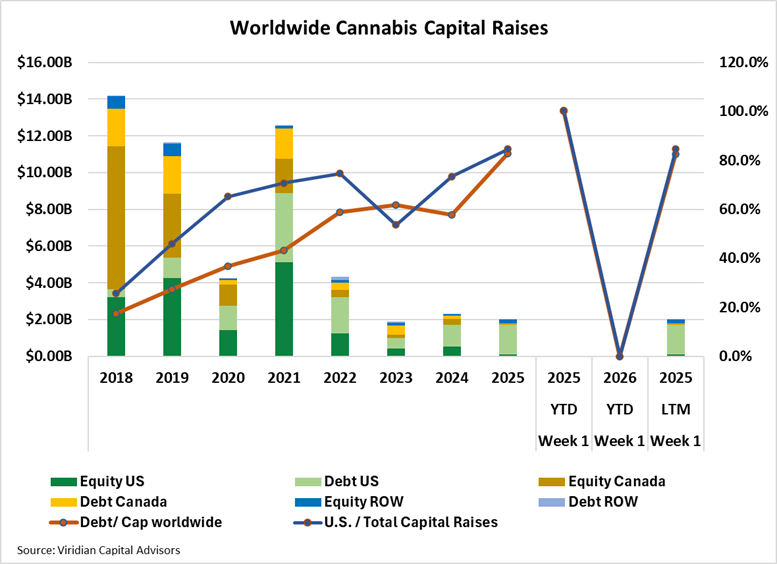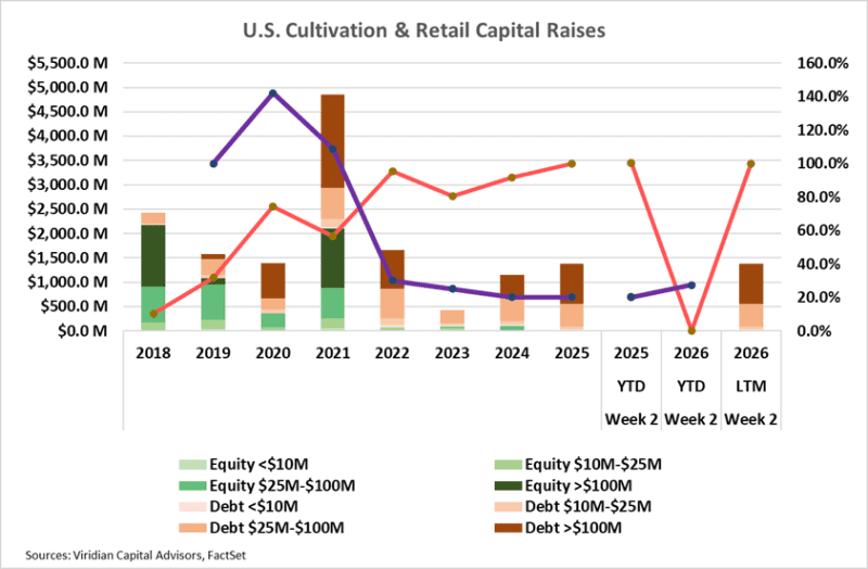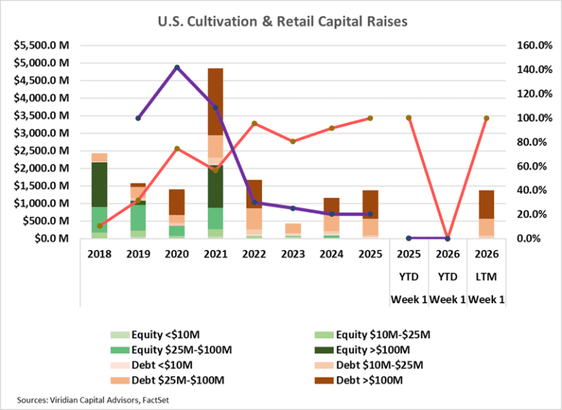 - For the LTM period, the capital raised in the cultivation and retail sector was $1.37B, 18.5% higher than in 2024, which in turn was 160% higher than in 2023.