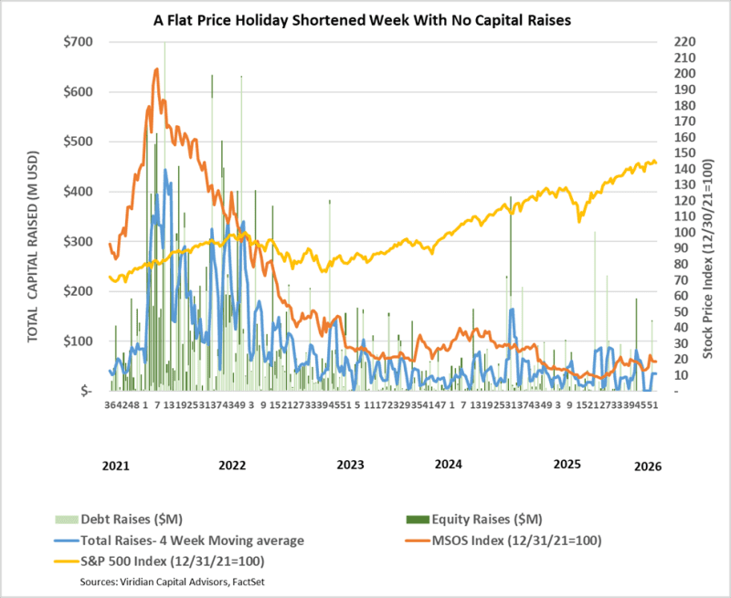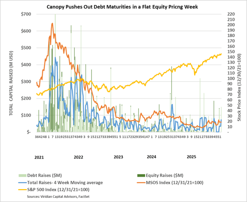 - Cannabis equity prices (as measured by the MSOS ETF) fell by 0.4% for the week.