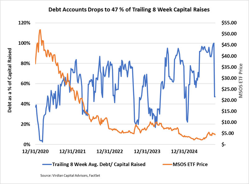 - Debt accounted for 47% of trailing 8-week capital raises. We believe that a successful move to S3 will increase the likelihood of other near-term regulatory moves, such as the SAFER or STATES. The real question is what kind of price increase it will take before cannabis companies are willing to issue equity. Will the change to S3 result in a lasting price pop that could lead to re-equitization?