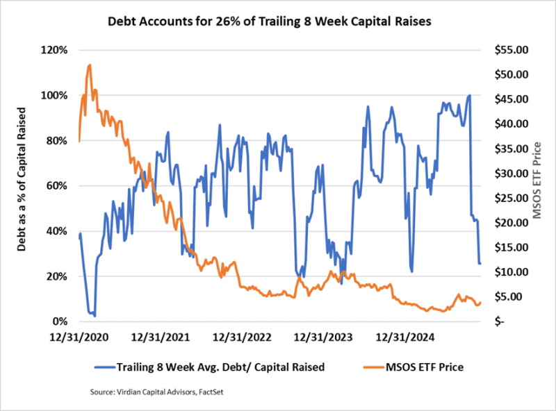 - Debt accounted for 23% of trailing 8-week capital raises.