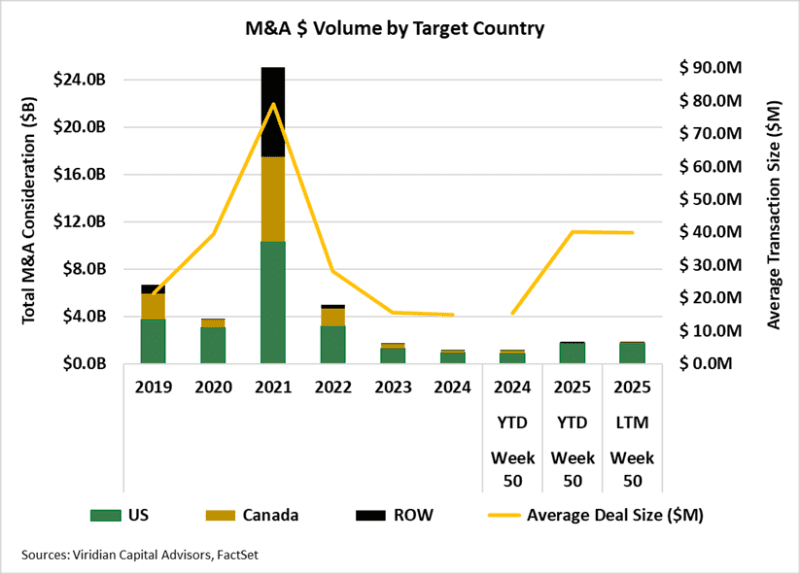 - YTD’s total M&A consideration is up 60.3% from the same period in 2024, while the deal count is down approximately 38.7%. Transactions targeting the U.S. are up 94.6% from roughly $877 million to $1.71 billion. LTM, 49 M&A transactions have closed, totaling $1.87B in disclosed value, up 59.5% from 2024.