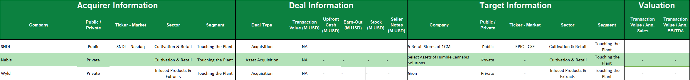 Viridian publishes weekly data on M&A transactions in the Cannabis/CBD/Psychedelic industries. This data includes information about the buyer and seller (public/private, state/country location), deal size, deal structure (cash, stock, earn-out), pricing, share information, and deal implied valuation.