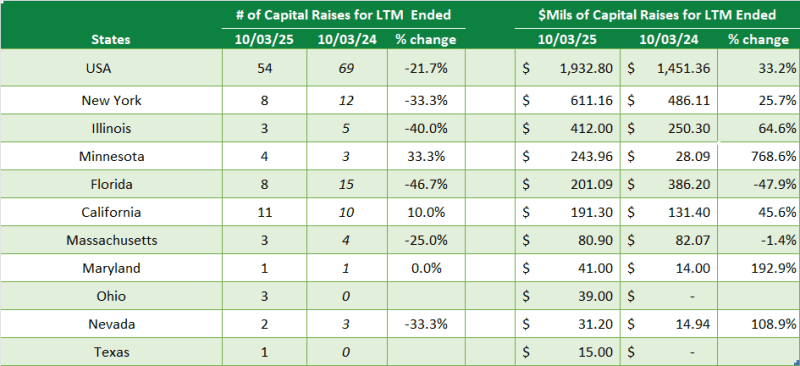 New York ranks number one in total capital raised at $611.16M and ties with Florida for second in total transaction volume with 8 total raises. Illinois ranks second in total capital raised at $412.00M for the LTM period ended 10/3/25. Minnesota ranks third in total invested capital at $243.96M for the LTM period ended 10/3/25.