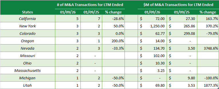 California leads all states in transaction volume with 5 deals completed in the LTM ending 1/9/2026. Colorado, Oregon, and New York tie for second with 3 deals each. Nevada, Missouri, Ohio, and Massachusetts each recorded 2 deals during the same period, tying for third place.