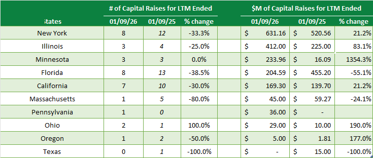 New York leads all states in total capital raised LTM with $631.2M. Illinois follows with $412.0M for the LTM ending 1/9/2026. Minnesota ranks third with $233.96M raised over the same period.