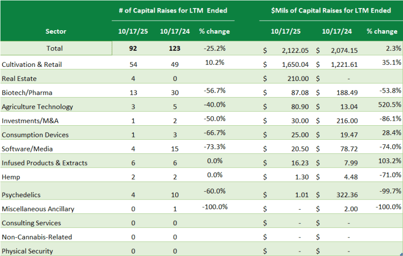 The Cultivation & Retail sector leads all sectors in total capital raised over the current LTM period with $1.65B in total invested capital and ranks first in transaction volume with 54 total transactions. The Real Estate sector ranks second in total invested capital at $210.00M for the LTM ended 10/17/2025. The Biotech/Pharma sector ranks third in total capital invested at $87.08M for the LTM ended 10/17/2025.