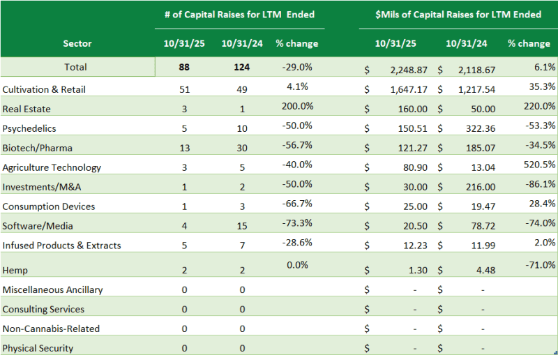 The Cultivation & Retail sector leads all sectors in total capital raised over the current LTM period with $1.65B in total invested capital and ranks first in transaction volume with 51 total transactions. The Real Estate sector ranks second in total invested capital at $160.00M for the LTM ended 10/31/2025. The Psychedelics sector ranks third in total capital invested at $150.51M for the LTM ended 10/31/2025.