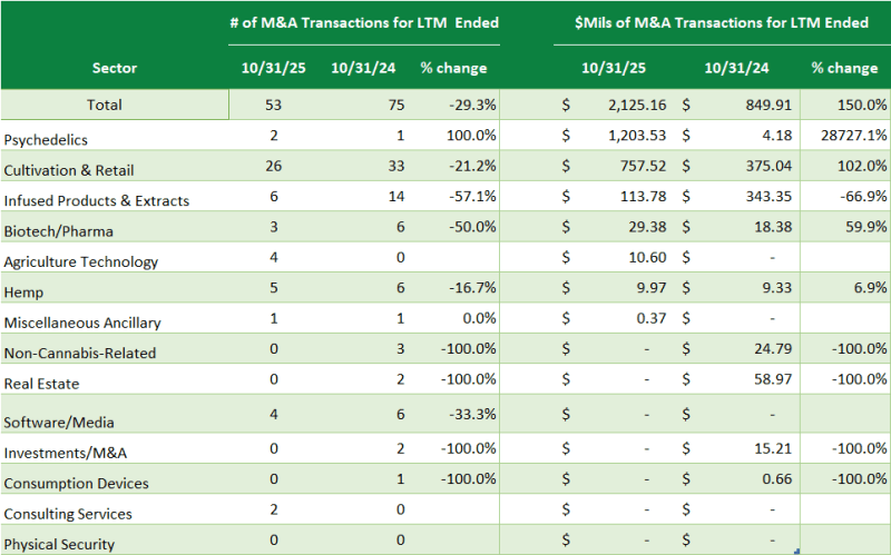 The Psychedelics sector leads all sectors in total M&A transaction value with $1.20B in total deal consideration. The Cultivation & Retail sector ranks second in total M&A consideration at $757.52M for the LTM ended 10/31/25. The Infused Products & Extracts sector ranks third in total M&A consideration at $113.78M for the LTM period ended 10/31/25.