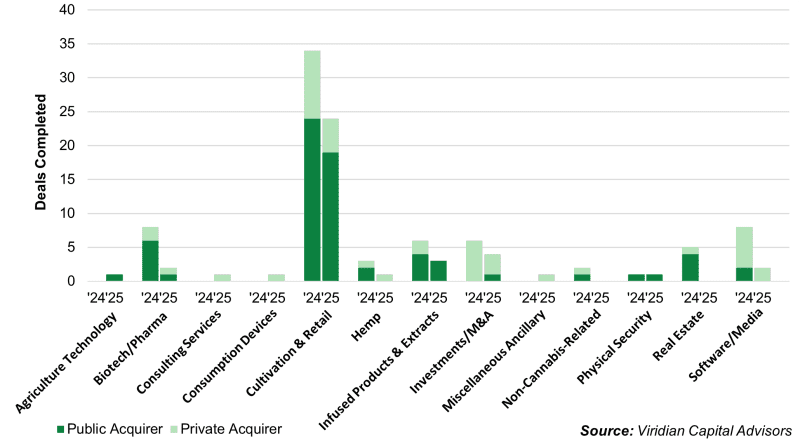 Viridian Capital Advisors partitions the cannabis universe into 12 subsectors and each week we follow the transactions that occur in each of these subsectors, giving investors the ability to spot sector rotations early.