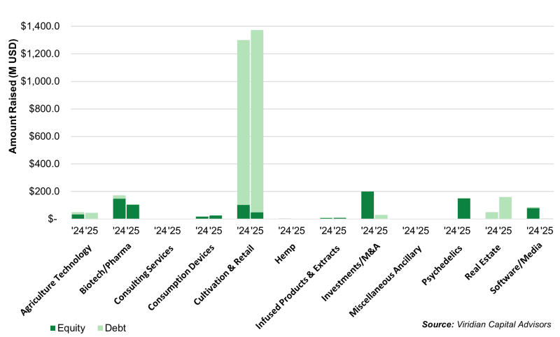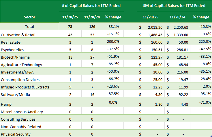 Cultivation & Retail leads all sectors in total capital raised over the LTM ending 11/28/2025 with $1.57B and also ranks first in transaction volume with 45 deals. Real Estate ranks second with $160.0M raised, followed by Psychedelics at $150.5M.