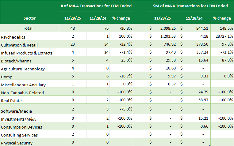The Psychedelics sector leads all categories with $1.20B in total M&A transaction value. Cultivation & Retail follows with $746.9M for the LTM ending 11/28/2025. Infused Products & Extracts ranks third with $97.5M over the same period.