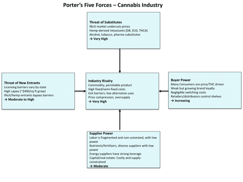 - Exit Barriers: Specialized grow facilities and equipment have little alternative use value, locking weak competitors into the market and prolonging price wars and supply gluts.