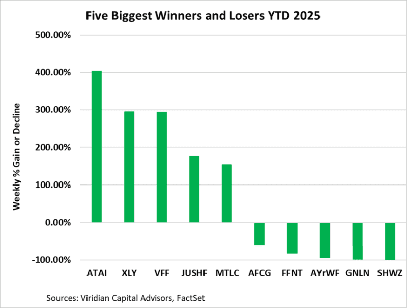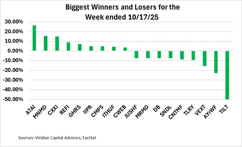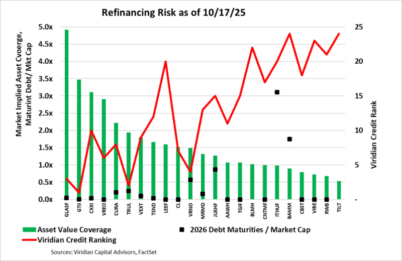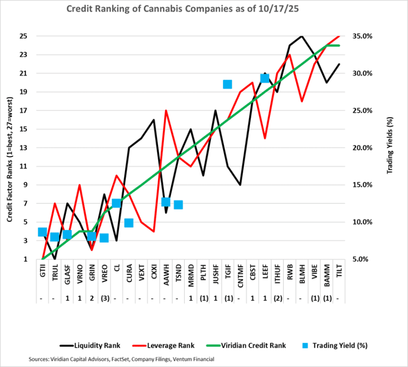 - The chart below displays our updated credit rankings for 25 U.S. cannabis companies as of October 17, 2025. We have reduced our ranking set from 30 to 25 companies by eliminating AYR, CLS, FFNT, GRAM, and SHWZ. Each of these companies is either in receivership (FFNT, GRAM), in restructuring discussions (AYR & SHWZ), or has out-of-date financials (AYR, FFNT, GRAM, SHWZ). Additionally, each trade is significantly out of the money, with stock price movements driven primarily by volatility rather than valuation.