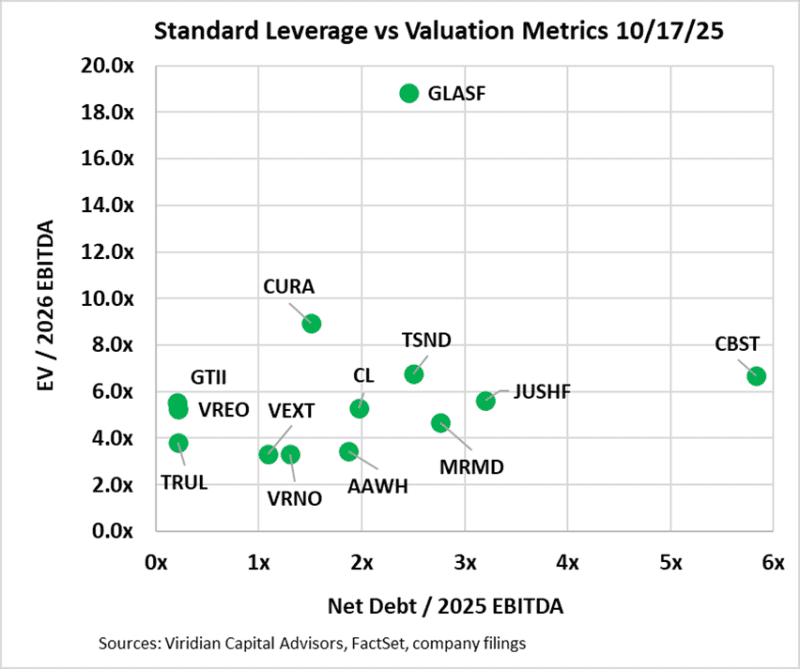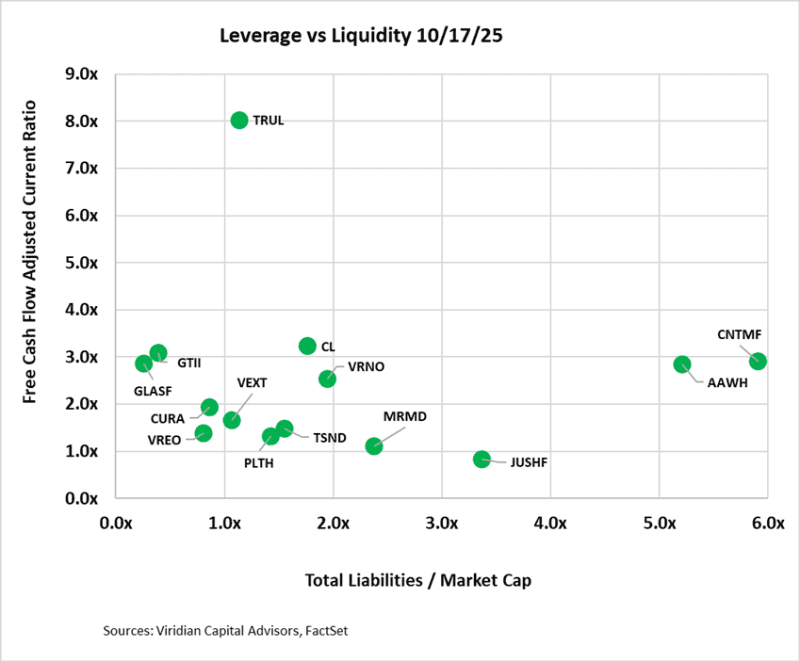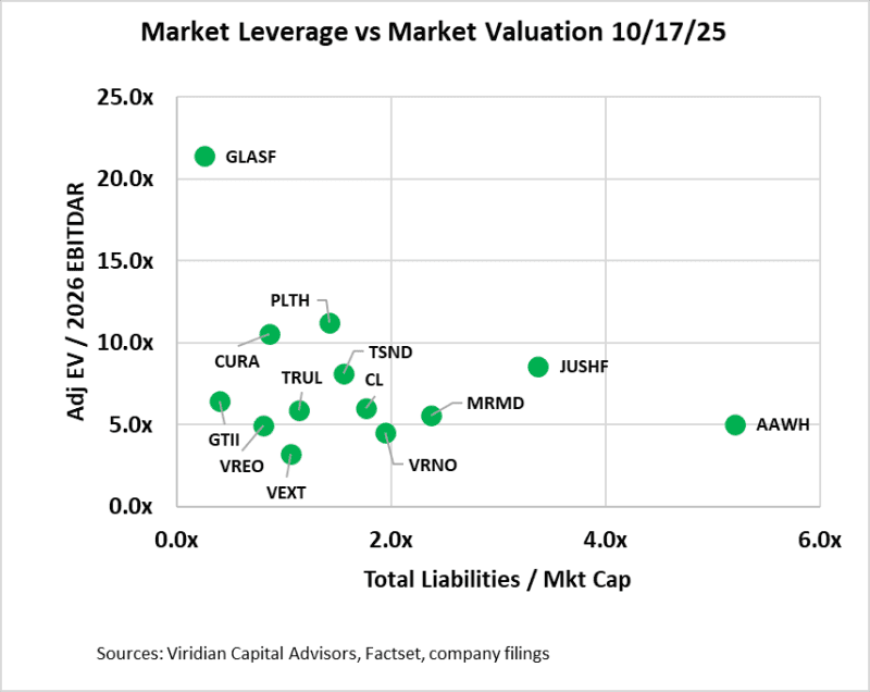 - On the bottom left are companies with an Adj. EV/2025 EBITDAR ratio of under 7x and total liabilities to market cap of under 2x. The group includes GTI, Trulieve, Verano, Cresco, and Vext. Companies in this quadrant are right to consider stock repurchases or using cash in acquisitions. They can afford some additional debt and can take advantage of the ongoing dislocation in equity prices.
